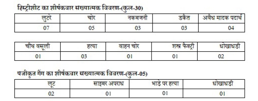जनपद में अपराध नियंत्रण हेतु 30 अपराधियों की हिस्ट्रीशीट खोली गई और 05 नए अपराधियों के अपराधिक गैंग का पंजीकरण किया गया। लिस्ट पुलिस अधीक्षक के निर्देशानुसार जनपद में अपराध और अपराधियों पर नियंत्रण लगाने हेतु अपराधियों के विरुद्ध चलाए जा रहे अभियान के क्रम में पुलिस द्वारा द्वारा लूट, डकैती,अपहरण, नकबजनी ,अवैध मादक पदार्थ, चौथ वसूली ,हत्या ,वाहन चोरी, शस्त्र फैक्ट्री जैसे अपराधों में शामिल अपराधियों की निगरानी करने हेतु 30 अपराधियों की हिस्ट्री शीट खोली गई और साथ ही लूट, साइबर अपराध ,भाड़े पर हत्या एवं धोखाधड़ी के अंतर्गत पांच नए नवीन अपराधियों की गैंग का पंजीकरण किया गया।
