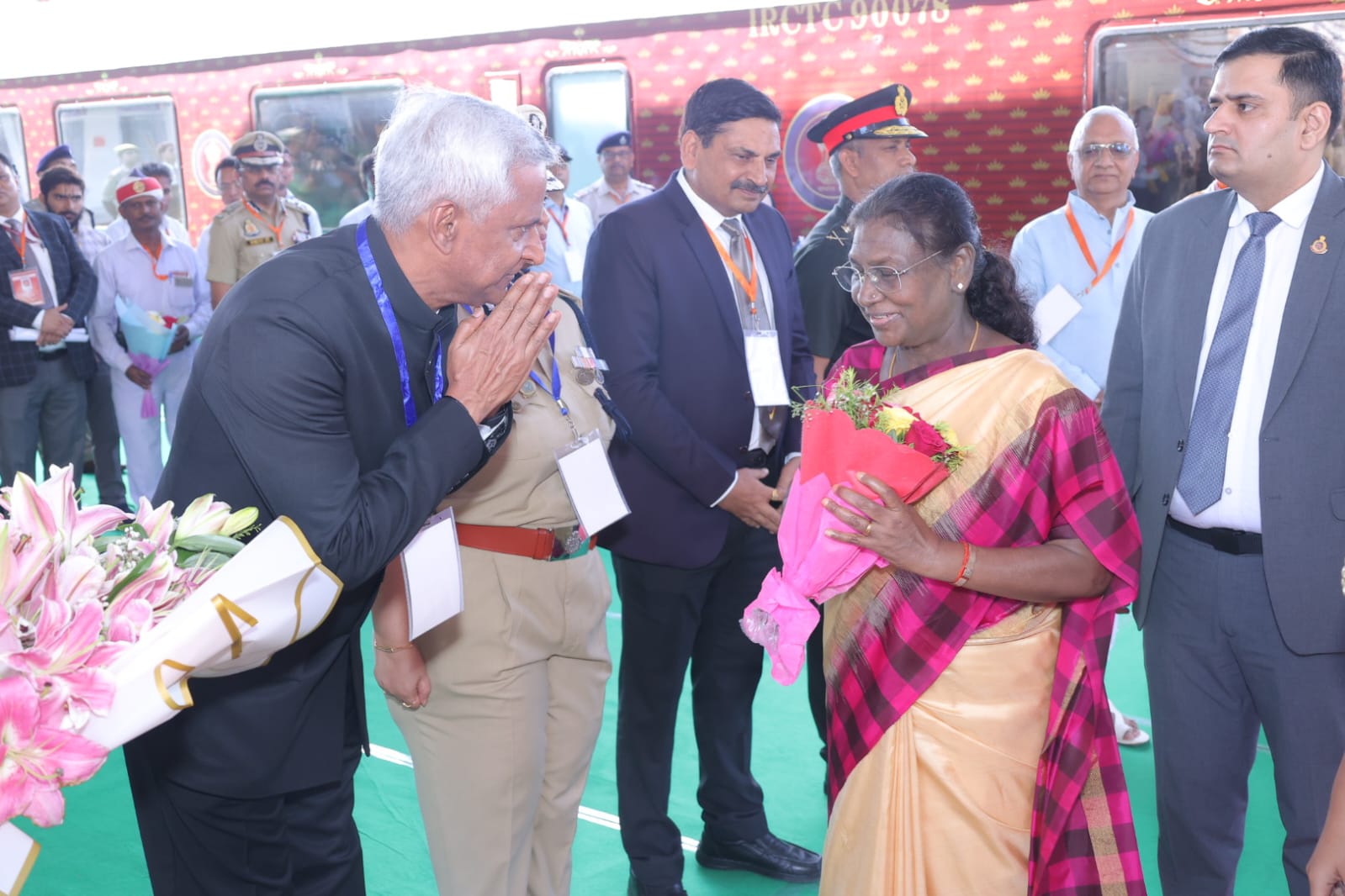 मथुरा- महामहिम राष्ट्रपति द्रौपदी मुर्मु लगभग प्रातः 10 बजे वृन्दावन रोड रेलवे स्टेशन पहुँची। वृन्दावन रोड रेलवे स्टेशन पर महामहिम राष्ट्रपति द्रौपदी मुर्मु का स्वागत मंत्री गन्ना विकास एवं चीनी उद्योग लक्ष्मी नारायण चौधरी जी, माननीय महापौर विनोद अग्रवाल , लै0 जनरल वी0 हरिहरन (अति विशिष्ट सेवा मेडल, सेना मेडल, जनरल ऑफिसर कमांडिंग, 1 कोर मथुरा), महाप्रबंधक उत्तर मध्य रेलवे इलाहाबाद नरेश पाल सिंह, अपर पुलिस महानिदेशक अनुपम कुलश्रेष्ठ, मण्डलायुक्त शैलेन्द्र कुमार सिंह, मंडल रेल प्रबंधक आगरा गगन गोयल, एफ (पी) टीएसी, सीडीआर, 8 टीएसी कैप्टन शिवम मनचंदा, जिलाधिकारी/जिला मजिस्ट्रेट चन्द्र प्रकाश सिंह एवं वरिष्ठ पुलिस अधीक्षक श्लोक कुमार द्वारा किया गया। वृन्दावन रोड रेलवे स्टेशन से महामहिम राष्ट्रपति द्रौपदी मुर्मु बांके बिहारी मंदिर के दर्शन करने हेतु रवाना हुई। महामहिम श्री बांके बिहारी जी मंदिर के निकट बनी पार्किंग पहुंची, जहाँ से गोल्फ कार्ट के माध्यम से श्री बांके बिहारी जी मन्दिर को प्रस्थान किया।