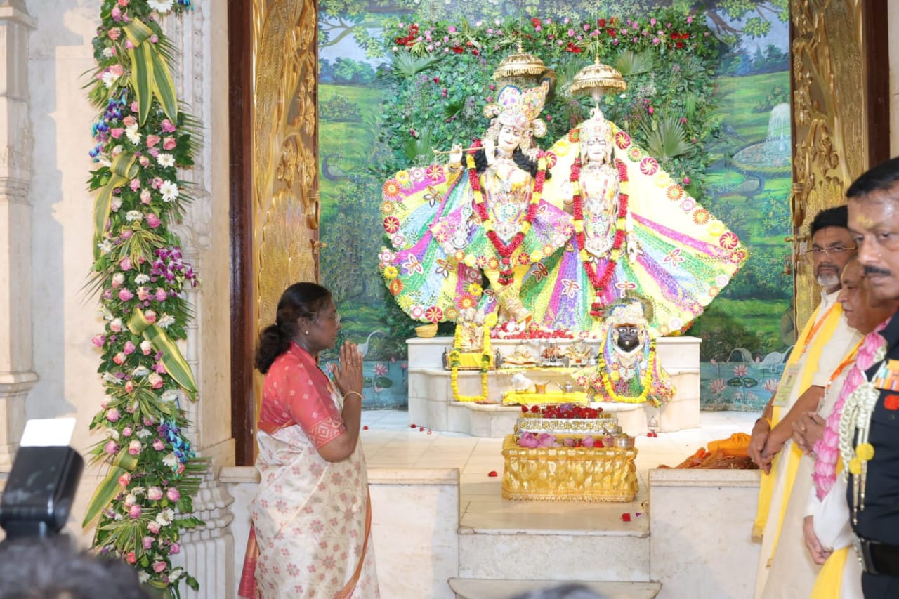 महामहिम राष्ट्रपति श्रीमती द्रौपदी मुर्मु जी दर्शन हेतु श्रीकृष्ण जन्मस्थान मन्दिर पहुँची। महामहिम राष्ट्रपति श्रीमती द्रौपदी मुर्मु जी ने श्री केशव देव जी मन्दिर के दर्शन किये तथा विधिविधान से पूजा अर्चना की। उन्होंने श्री योग माया जी मन्दिर तथा गर्भगृह मन्दिर में पूजा की और आर्शीवाद प्राप्त किया। इसके उपरान्त महामहिम राष्ट्रपति श्रीमती द्रौपदी मुर्मु जी ने भागवत मन्दिर के दर्शन किये। भागवत मन्दिर में मंत्रोच्चारण के साथ महामहिम जी ने विधि-विधान से पूजा अर्चना की। इसके साथ ही महामहिम जी ने श्री जगन्नाथ मन्दिर जी के दर्शन किये। मा० मंत्री गन्ना विकास एवं चीनी उद्योग श्री लक्ष्मी नारायण चौधरी जी ने उत्तर प्रदेश सरकार की ओर से महामहिम जी को श्री राधा कृष्ण जी की सुन्दर मूर्ति भेंट की। श्रीकृष्ण जन्मस्थान मन्दिर प्रबंधन द्वारा महामहिम जी को स्मृति चिन्ह भेंट किया गया। मन्दिर प्रबंधन से श्री अनुराग डालमिया, श्री गोपेश्वर नाथ चतुर्वेदी एवं श्री कपिल शर्मा मौजूद रहे। श्रीकृष्ण जन्मस्थान मन्दिर के दर्शन के उपरान्त महामहिम राष्ट्रपति श्रीमती द्रौपदी मुर्मु जी मथुरा जंक्शन रेलवे स्टेशन पहुँची, जहां से दिल्ली के लिए प्रस्थान किया। मथुरा जंक्शन रेलवे स्टेशन पर मा० मंत्री गन्ना विकास एवं चीनी उद्योग श्री लक्ष्मी नारायण चौधरी जी, मा० महापौर श्री विनोद अग्रवाल, मा० जिला पंचायत अध्यक्ष श्री किशन सिंह, मा० विधायक मांट श्री राजेश चौधरी, मा० विधायक बल्देव श्री पूरन प्रकाश, मा० विधायक मथुरा श्री श्रीकांत शर्मा, मा० विधायक गोवर्धन श्री मेघश्याम सिंह, मा० एमएलसी श्री योगेश चौधरी, मा० एमएलसी श्री ओमप्रकाश सिंह, उ०प्र० ब्रजतीर्थ विकास परिषद के उपाध्यक्ष श्री शैलजा कांत मिश्र, महानगर अध्यक्ष श्री हरिशंकर राजू यादव आदि मौजूद रहे।